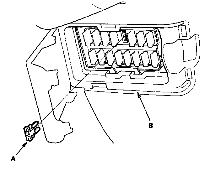 - Turn the ignition switch OFF, and remove the No.13 CLOCK BACKUP fuse (7.5 A) (A) from the passenger's under-dash fuse/relay box (B) for 10 seconds.