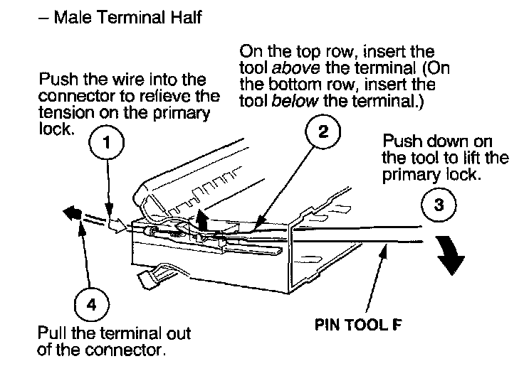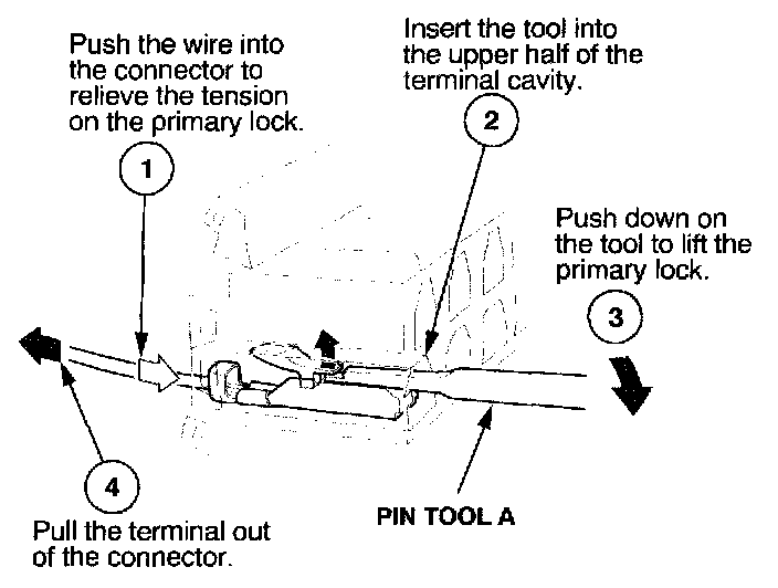 Before you begin, inspect the wire you are about to repair for damage and length. Make sure the wire will be long enough to make a terminal repair without stretching it when you reinstall the terminal in the connector. If the wire is too short, or if access to the connector is too restricted to make a terminal repair, you may need to install a pigtail terminal (a short length of wire with a factory-crimped terminal on it). Refer to HOW TO INSTALL PIGTAIL TERMINALS.