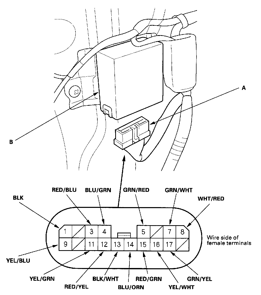 2. Disconnect the 18P connector (A) from the power window control unit (B).