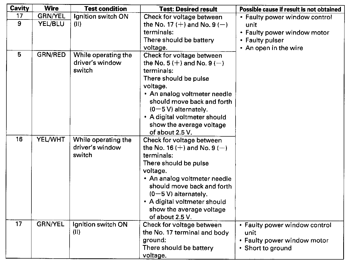 5. Reconnect the 18P connector to the power window control unit, and reconnect the passenger's multiplex control unit. Then make these input tests at the connector.