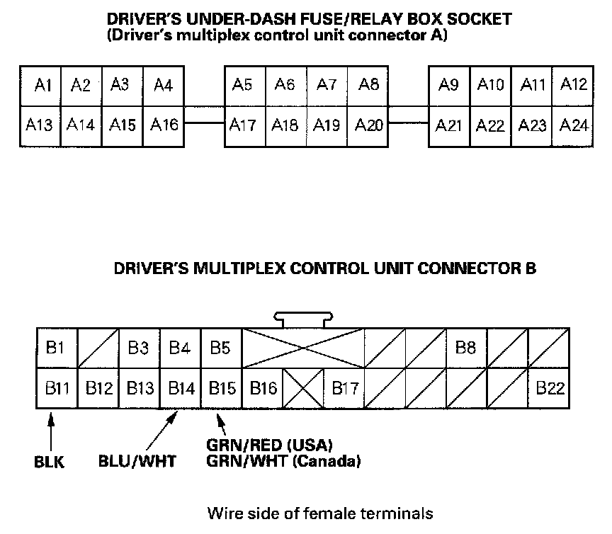 4. With the driver's multiplex control unit still disconnected, make these input tests at the connector and fuse/relay box socket.