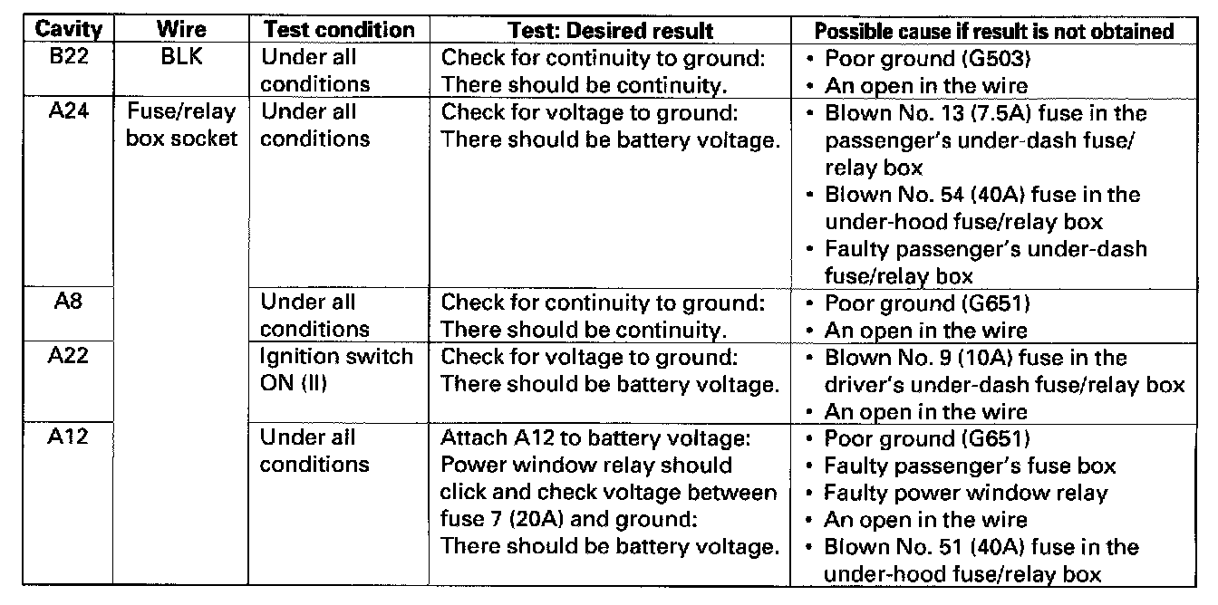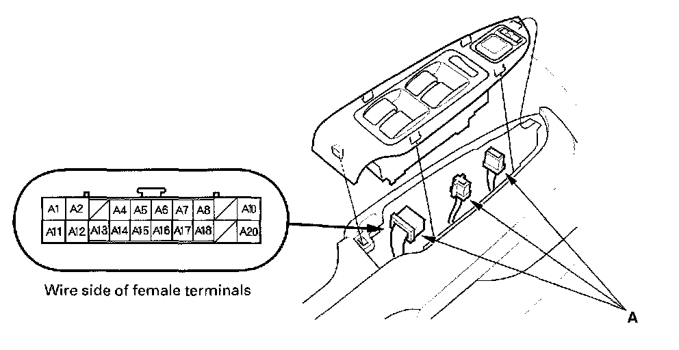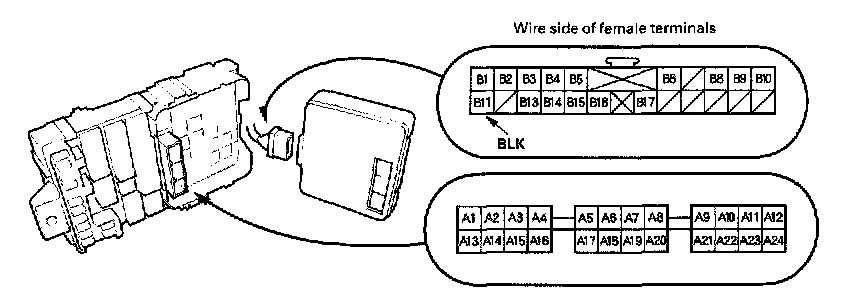 10. Make the following input tests at 22P connector Band the driver's under-dash fuse/relay box socket connector A. Be careful not to spread the fuse box connectors.