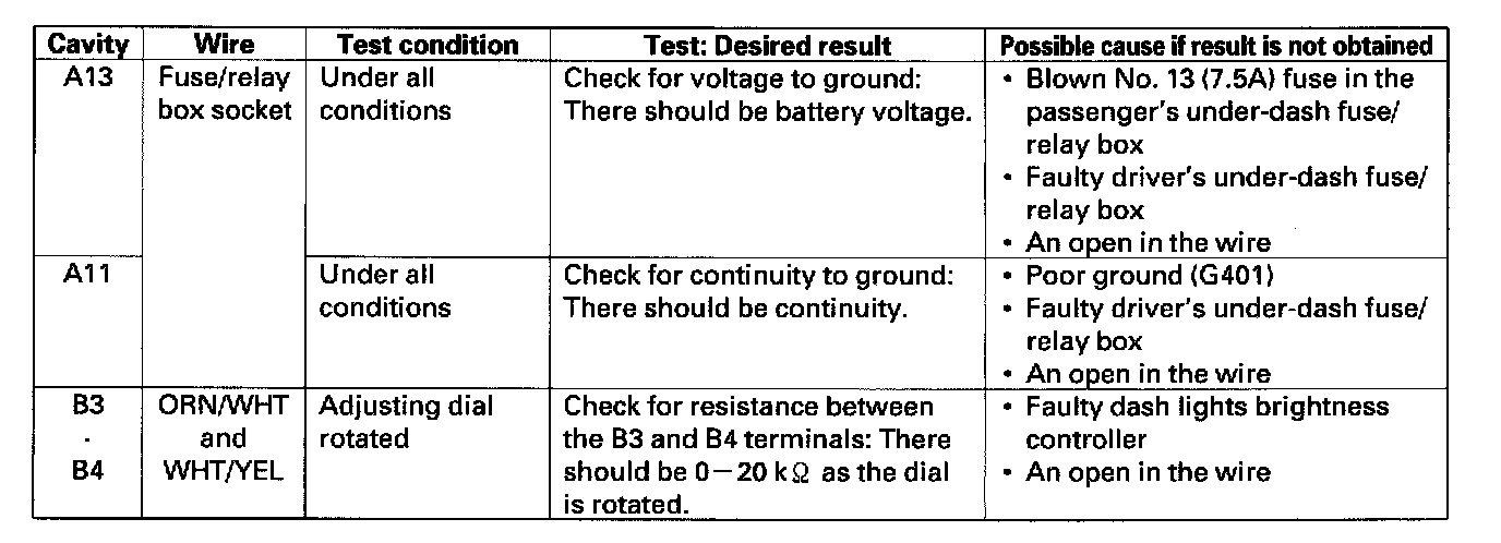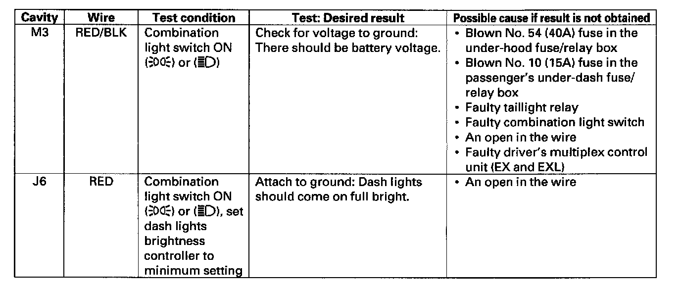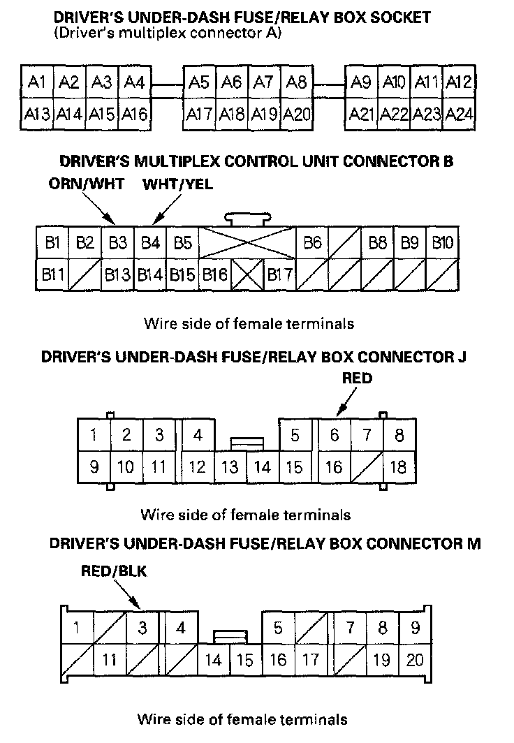 4. Reconnect the driver's multiplex control unit to the driver's under-dash fuse/relay box, and perform the following input tests at the appropriate connectors on the driver's under-dash fuse/relay box.