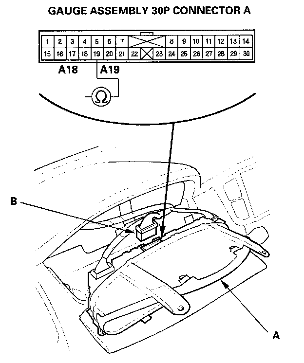 4. At the gauge assembly 30P connector A, measure resistance between the No. 19 and No. 18 terminals while rotating the adjusting dial. Resistance should vary from 0 to 20,000 Ohms as the dial is rotated.