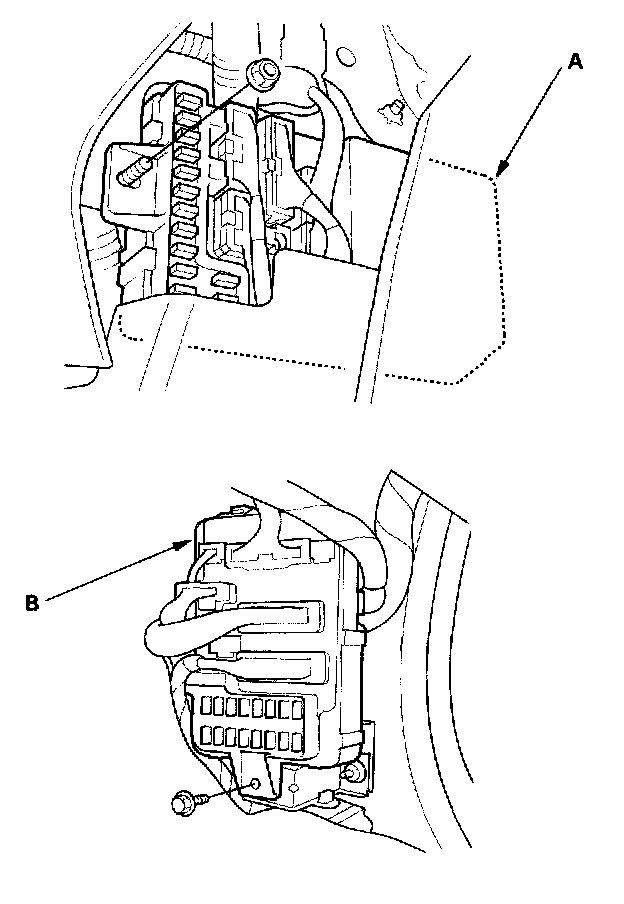 4. Remove the mounting nut or bolt, and pull the driver's under-dash fuse/relay box (A) or passenger's under-dash fuse/relay box (B) away from the body.