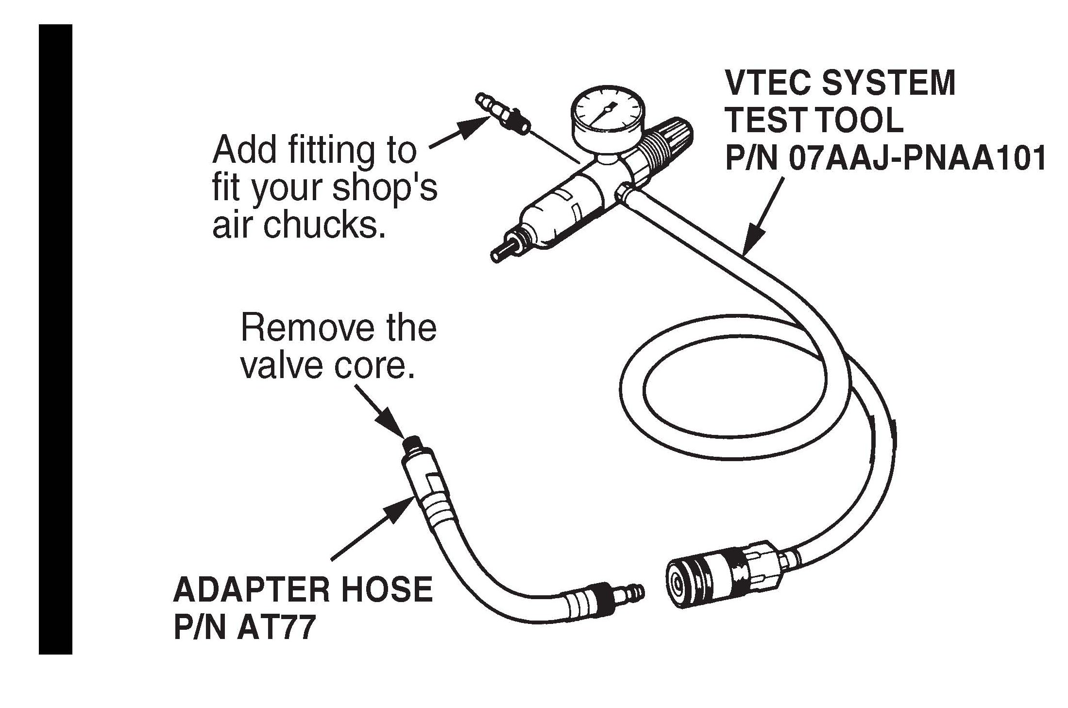 For some problems, the VTEC System Test Tool can be used to pressure-check the engine block for oil leaks. A similar tool was first used in 1992 to check the rocker arms on VTEC engines (see Service Bulletin 91-038, VTEC Inspection Tool).