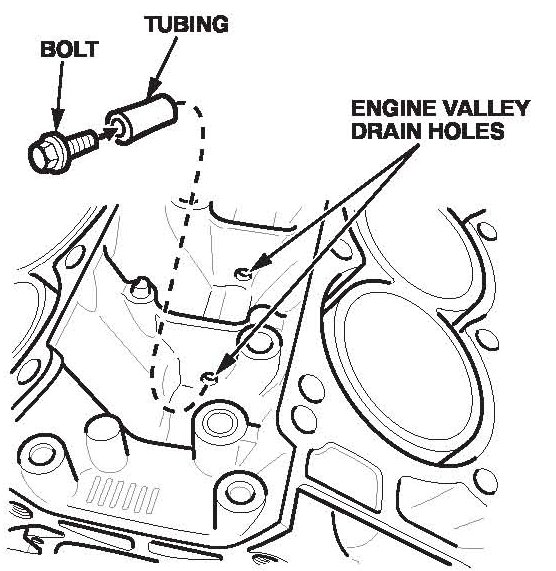 To fill an engine valley section with soapy water, plug the drain hole in the valley with a piece of tubing (P/N 36285-P8A-A00, H/C 5181730) around a 6 x 15 mm bolt.
