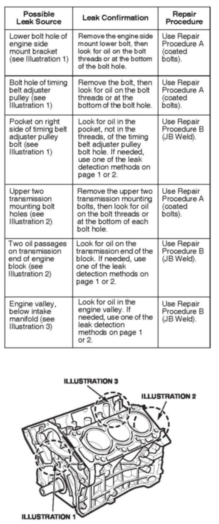 5. Shut off the engine, and inspect the leak area. Once you find the leak, go to Confirming the Leak on page 3, and use the chart to determine whether to follow Repair Procedure A or Repair Procedure B.