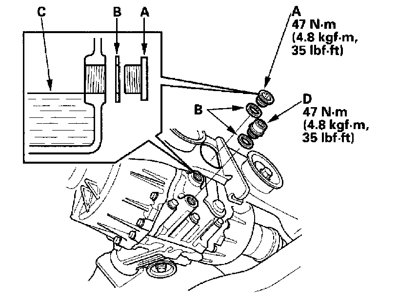 2. Remove the oil filler plug (A) and sealing washer (B), then check the condition of the fluid, and make sure the fluid is at the proper level (C).