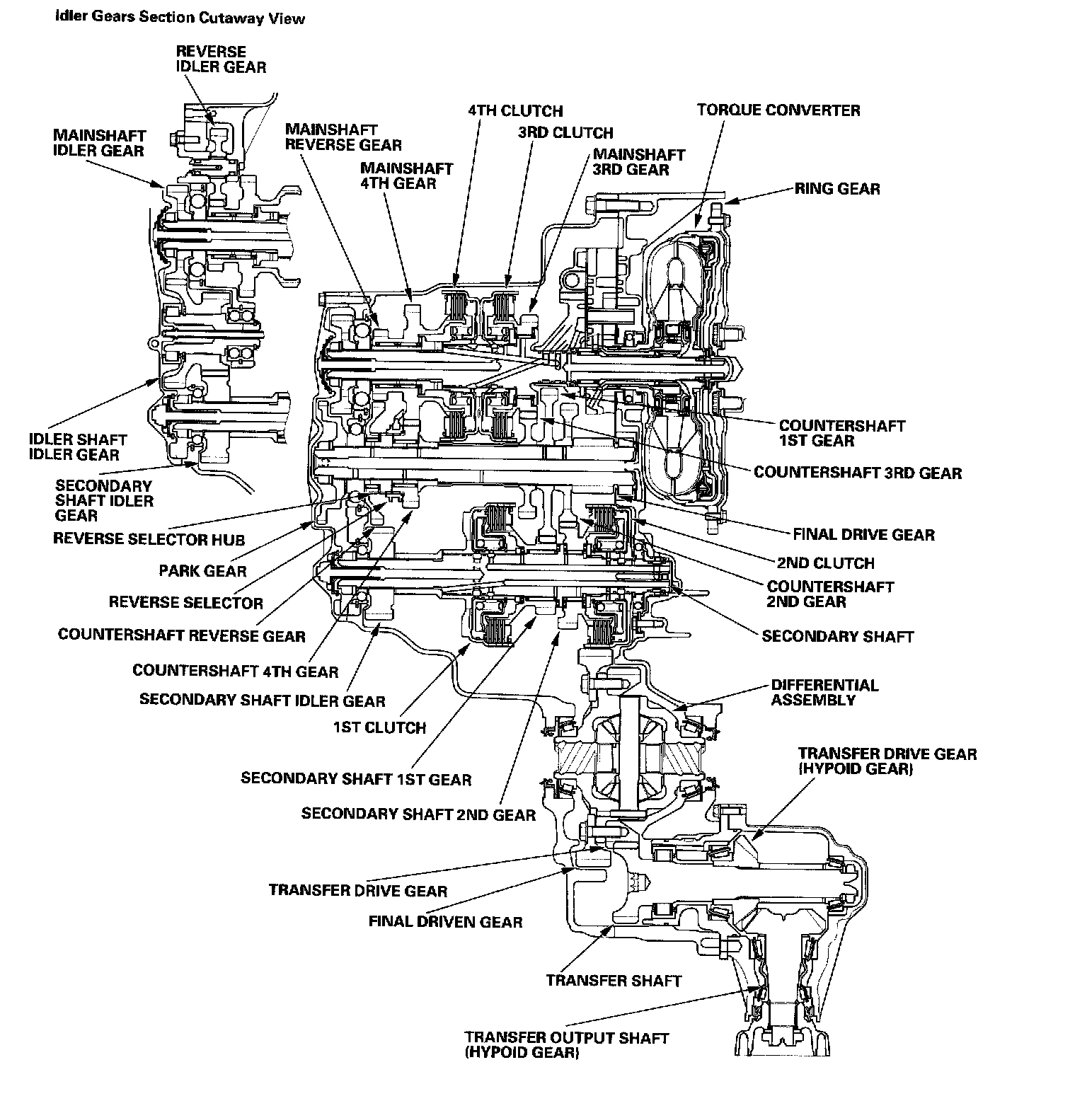 Transmission Cutaway ViewNOTE: The illustration shows the 4WD transmission; 2WD does not have the transfer mechanism.