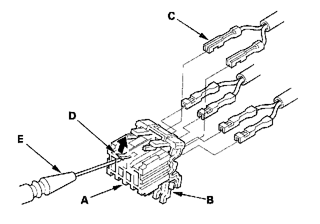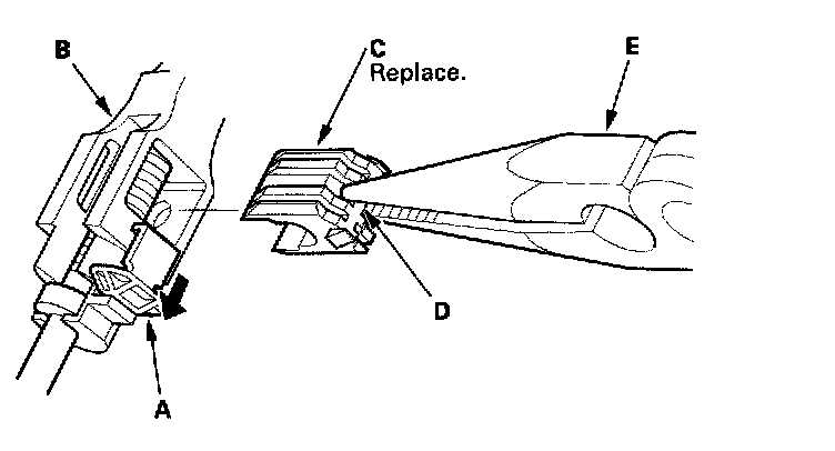 12. Remove the terminal (C) from the connector by pushing the lock tab (D) up in the connector using a thin blade screwdriver (E). Remove all six terminals.