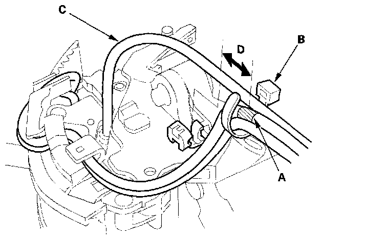 21. Align the marks (A) on the harnesses, and tie the harness band (B) over the marks. Clamp the O/D switch harness (C) 15 mm (0.6 inch) (D) from the harness band.