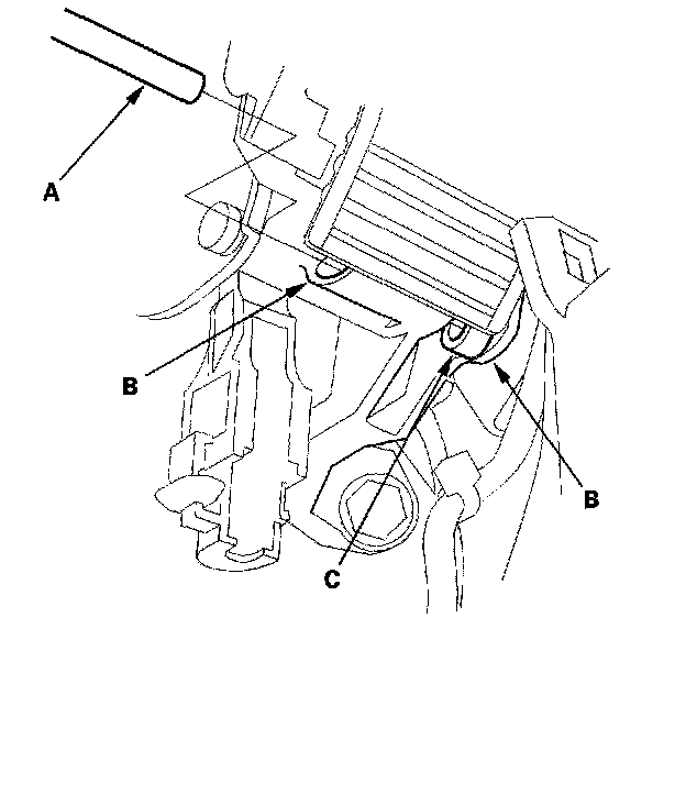 27. Insert a 6.0 mm (0.24 inch)m pin (A) into the positioning holes (B) on the shift lever bracket base and through the positioning hole (C) on the shift lever. The shift lever is secured in the R position.