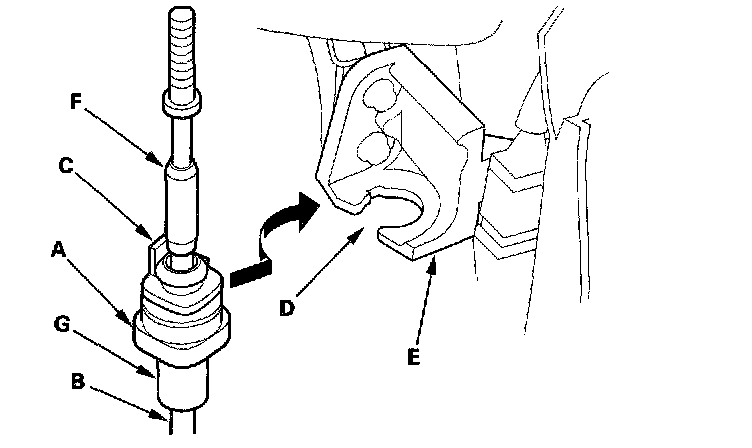 28. Rotate the socket holder (A) on the shift cable (B) to face the tab (C) on the holder opposite to the opening (D) in the socket holder bracket (E). Align the holder with the opening in the bracket, then slide the holder into the bracket. Rotate the holder a quarter turn to secure the shift cable. Do not install the shift cable by twisting the shift cable guide (F) and damper (G).