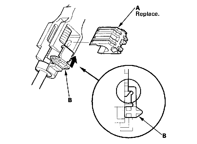 30. Install the new shift cable lock (A) to secure the shift cable end and shift cable end holder, then push the lock tab (B) up until it stops to lock the joint.