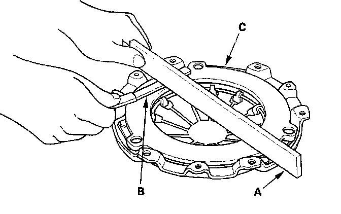 6. Inspect for warpage using a straight edge (A) and feeler gauge (B). Measure across the pressure plate (C). If the warpage is more than the service limit, replace the pressure plate.