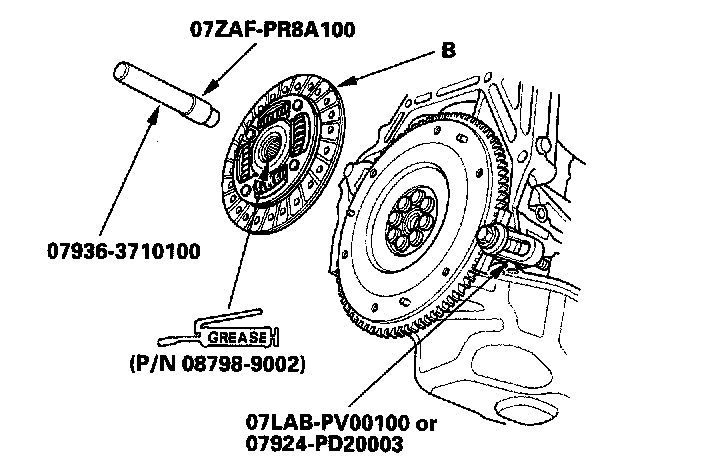 3. Apply Super High Temp Urea Grease (P/N 08798-9002) to the splines (A) of the clutch disc (B), then install the clutch disc using the special tools.