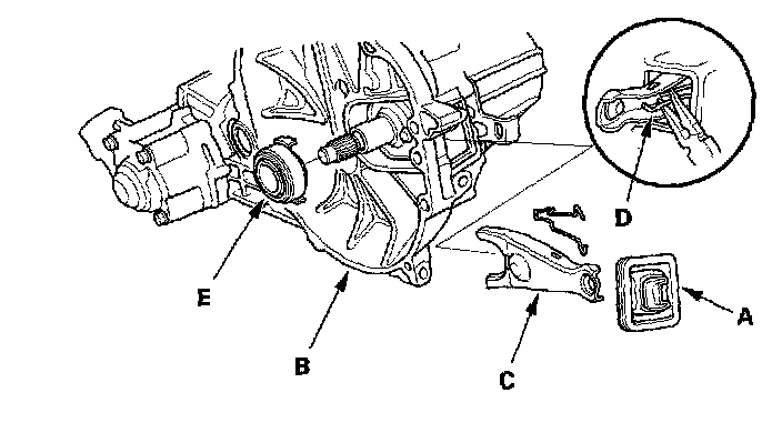 2. Remove the release fork (C) from the clutch housing (B) by squeezing the release fork set spring (D) with pliers. Remove the release bearing (E).