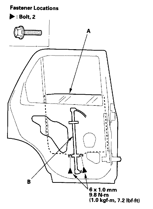 2. Carefully move the glass (A) until you can see the bolts, then remove them. Remove the glass from the regulator (B), and carefully lower the glass. Take care not to drop the glass inside the door.