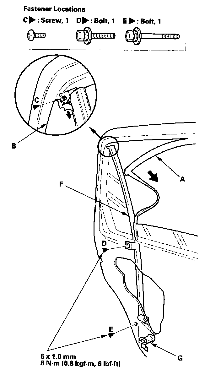 3. Pull the glass run channel (A) away as needed. Pull back the door quarter glass seal (B), then remove the screw (C). Remove the bolts (D, E) securing the center channel (F), then remove the collar (G).