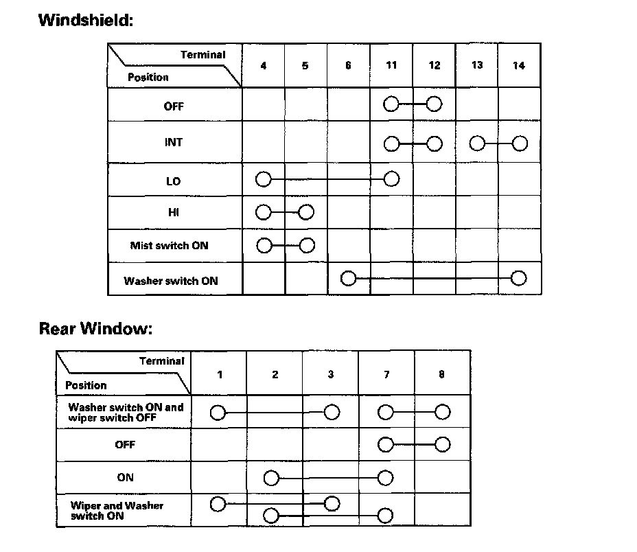 - If the terminals look OK, check for continuity between the terminals in each switch position according to the tables. If the continuity is not as specified, replace the switch.