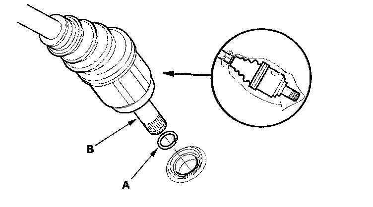 16. Install the new set ring (A) on the left driveshaft (B).