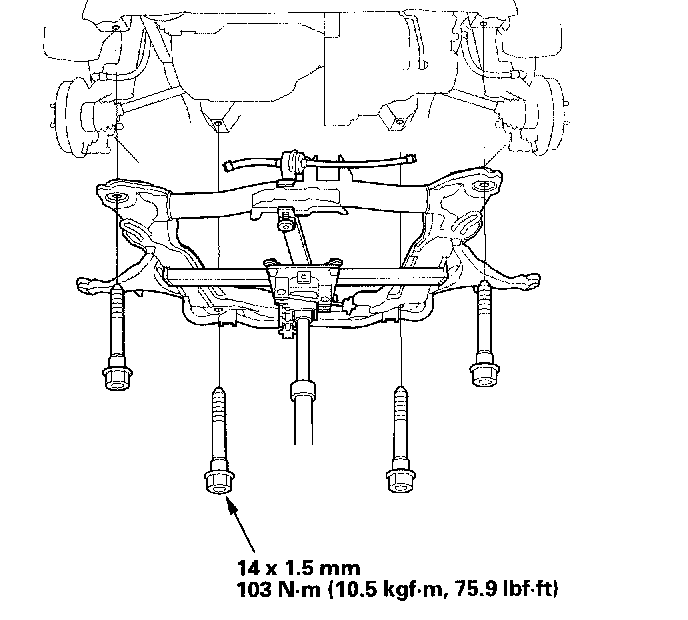 20. Loosely install the new sub-frame mounting bolts.