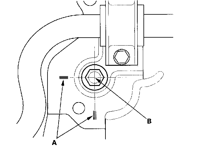 21. Align the reference marks (A) with the center of the sub-frame mounting bolts (B), then tighten the bolts to the specified torque.