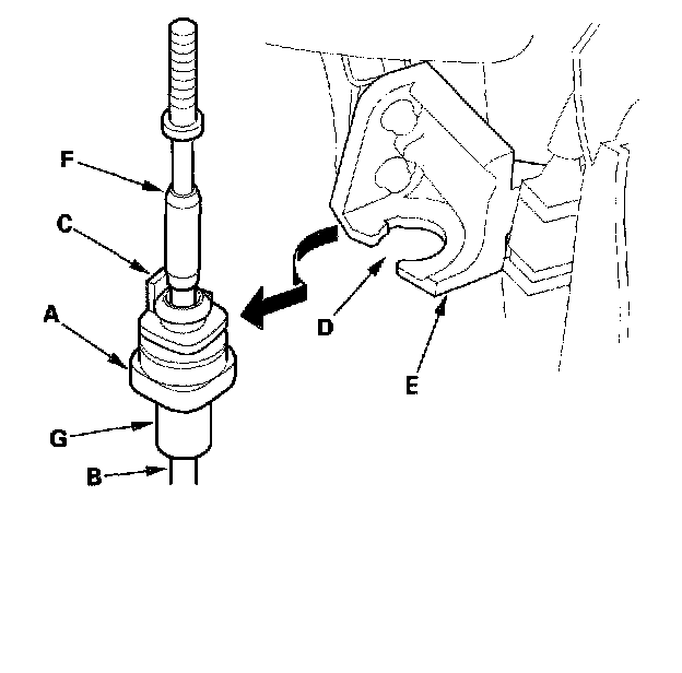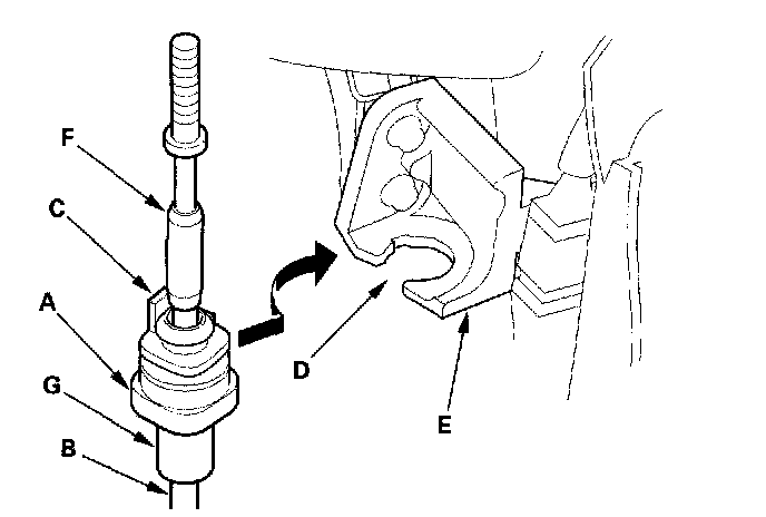 29. Rotate the socket holder (A) on the shift cable (B) to face the tab (C) on the holder opposite to the opening (D) in the socket holder bracket (E). Align the holder with the opening in the bracket, then slide the holder into the bracket. Rotate the holder a quarter turn to secure the shift cable. Do not install the shift cable by twisting the shift cable guide (F) and damper (G).