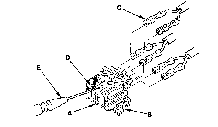 13. Remove the terminal (C) from the connector by pushing the lock tab (D) up in the connector using a thin blade screwdriver (E). Remove all six terminals.