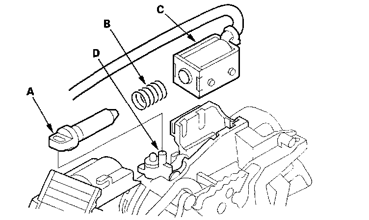 17. Install the shift lock solenoid by aligning the joint of the shift lock solenoid plunger with the tip of the shift lock stop (D).