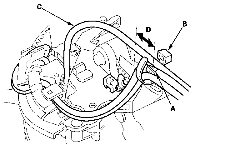 22. Align the marks (A) on the harnesses, and tie the harness band (B) over the marks. Clamp the O/D switch harness (C) 15 mm (0.6 inch) (D) from the harness band.