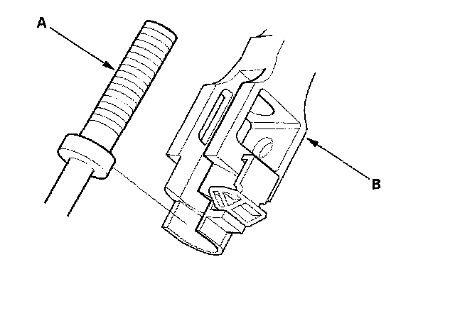 6. Slide the lock tab (A) down on the shift cable end holder (B).