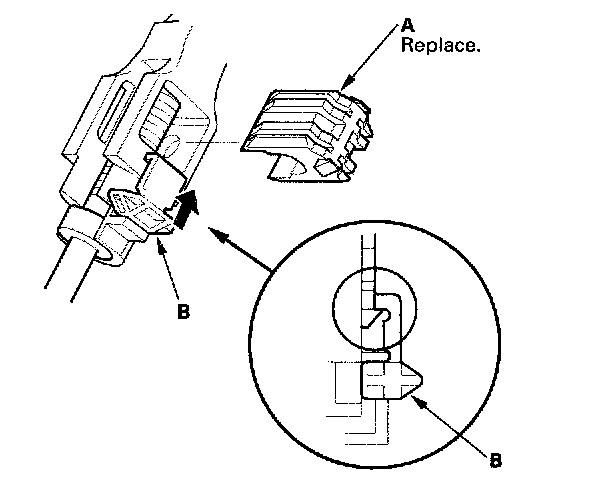 31. Install the new shift cable lock (A) to secure the shift cable end and shift cable end holder, then push the lock tab (B) up until it stops to lock the joint.