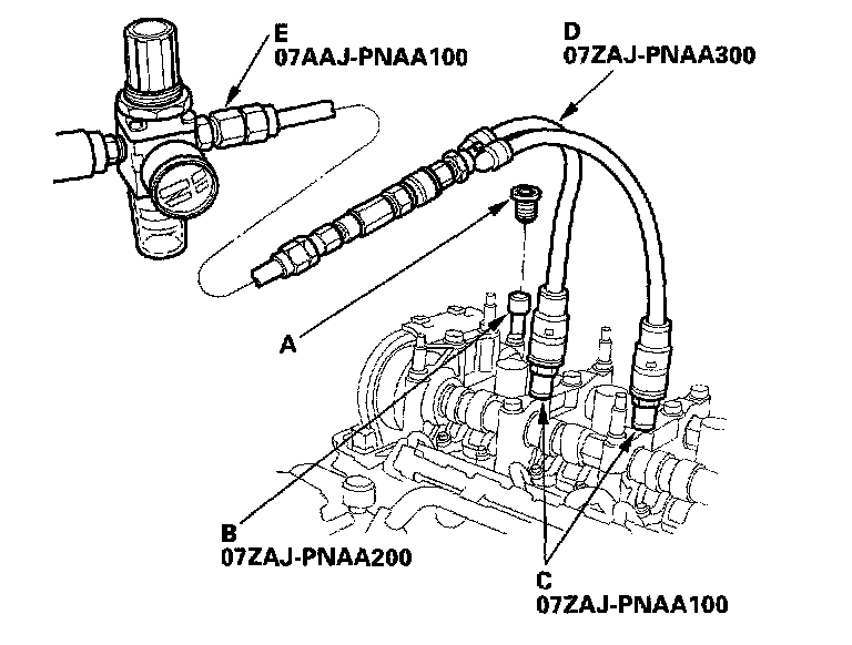 9. Remove the No. 2 and No. 3 camshaft holder bolts, and install the VTEC air adapters (C) finger-tight.