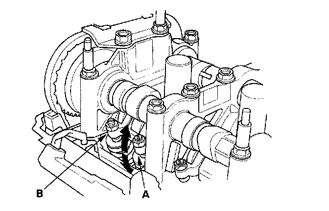 4. Verify that the intake primary rocker arm (A) moves independently of the intake secondary rocker arm (B).