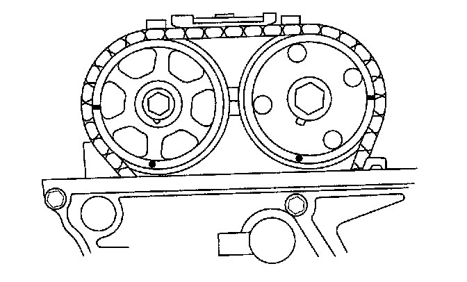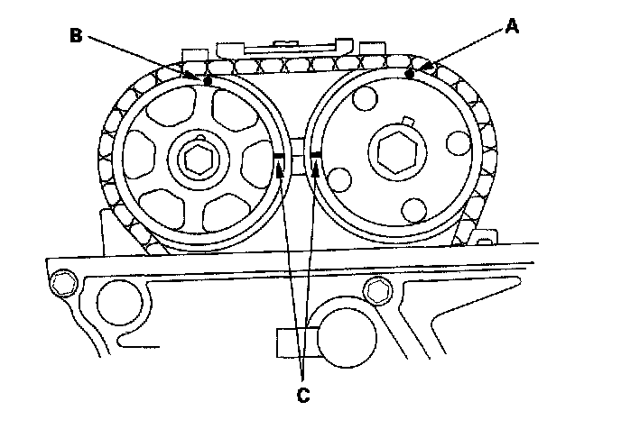 2. Set the No. 1 piston at Top Dead Center (TDC). The punch mark (A) on the variable Valve Timing Control (VTC) actuator and the punch mark (B) on the exhaust camshaft sprocket should be at the top. Align the TDC marks (C) on the VTC actuator and exhaust camshaft sprocket.