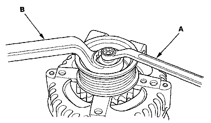 3. If the front bearing needs replacing, remove the pulley locknut with a 10 mm wrench (A) and a 22 mm wrench (B). If necessary, use an impact wrench.