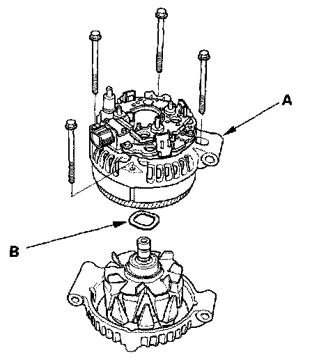 7. Remove the four bolts, then remove the rear housing assembly (A), and washer (B).
