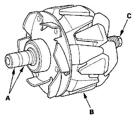 15. Check that there is no continuity between each slip ring and the rotor (B) and the rotor shaft (C).