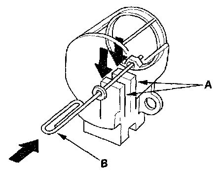 19. Push the brushes (A) in, then insert a pin or drill bit (B) (about 1.6 mm (0.06 in.) diameter) to hold them there.