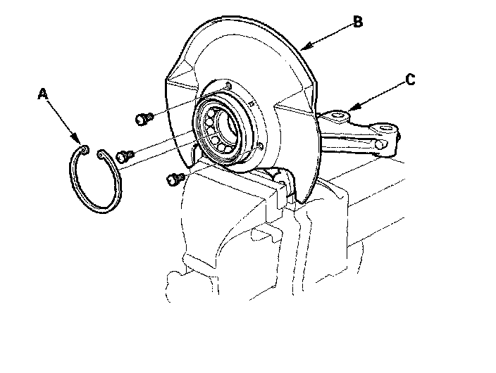 3. Remove the snap ring (A) and the splash guard (B) from the knuckle (C).