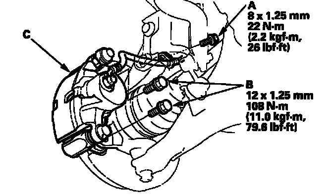 4. Remove the caliper bracket mounting bolts (B), and remove the caliper assembly (C) from the knuckle. To prevent damage to the caliper assembly or brake hose, use a short piece of wire to hang the caliper assembly from the undercarriage. Do not twist the brake hose with force.