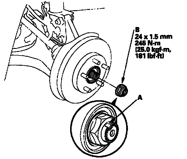 ^ Before installing the new spindle nut, apply a small amount of engine oil to the seating surface of the nut. After tightening, use a drift to stake the spindle nut shoulder against the driveshaft.