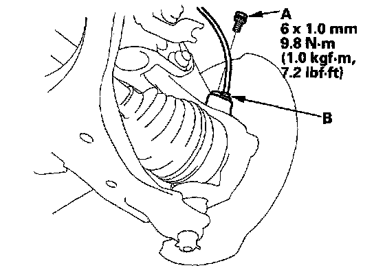 8. With ABS: Remove the flange bolt (A) and wheel sensor (B) from the knuckle. Do not disconnect the wheel sensor connector.