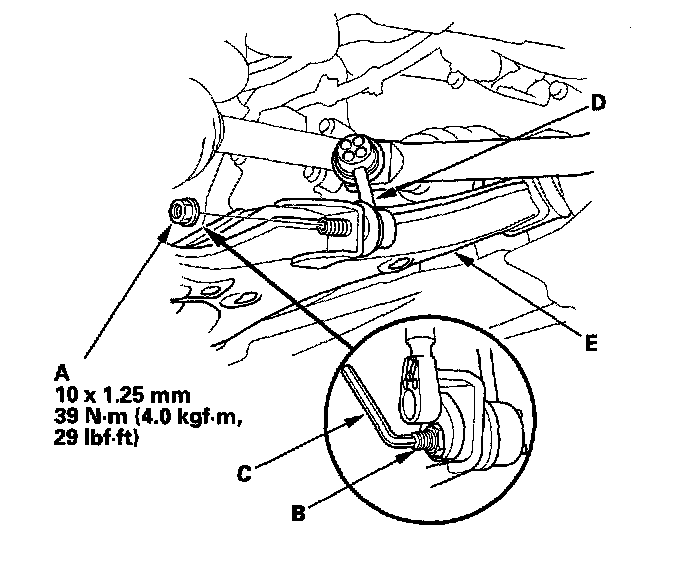 9. Remove the flange nut (A) while holding the joint pin (B) with a hex wrench (C), and disconnect the stabilizer link (D) from the lower arm (E).