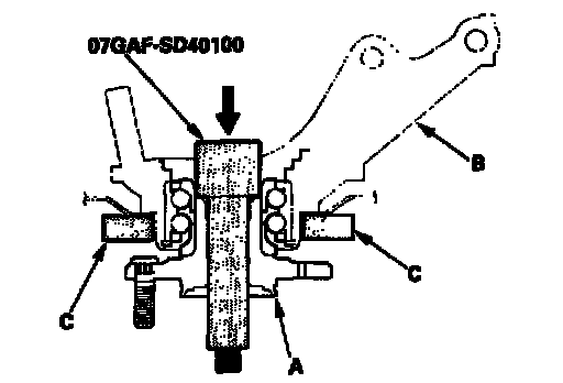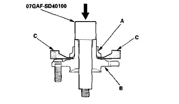 1. Separate the hub (A) from the knuckle (B) using the special tool and a hydraulic press. Hold the knuckle with the attachment (C) of the hydraulic press or equivalent tool. Be careful not to deform the splash guard. Hold onto the hub to keep it from falling when pressed clear.