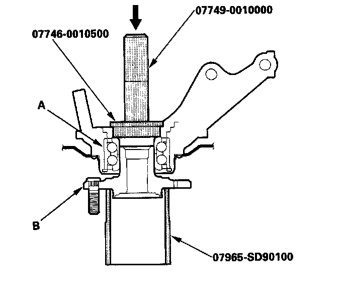 4. Press the wheel bearing (A) out of the knuckle (B) using the special tool and a press.