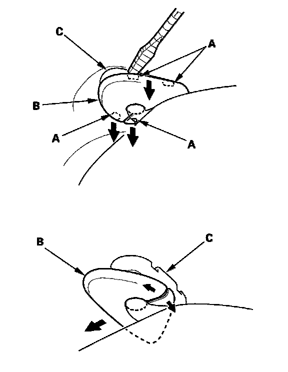 2. Release the tabs (A) on both sides with the appropriate tool from the KTC trim tool set, then remove the sunvisor cap (B) from the bracket (C). Turn the cap, and remove it.