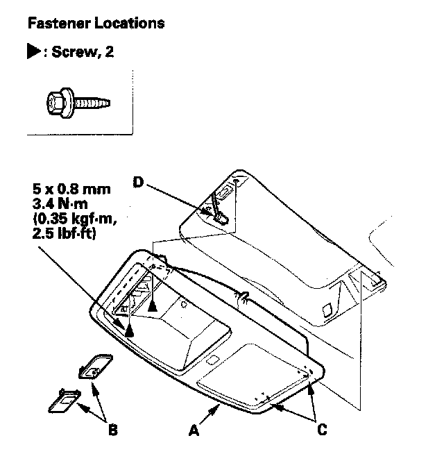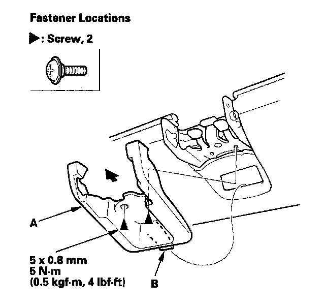 7. If equipped with a skylight, remove the screws, and slide the glass latch handle trim (A) forward to release the hook (B), then remove the trim.